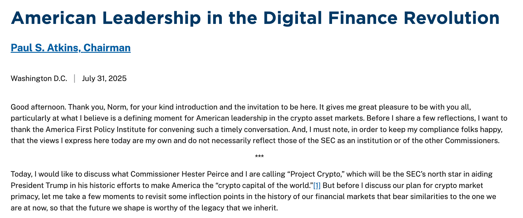 7 月 31 日,SEC 主席 Paul Atkins 启动了「加密项目」(Project Crypto)倡议。该计划涵盖多维度政策创新,核心聚焦监管现代化、代币分类、去中心化监管边界等关键领域,旨在彻底重塑美国加密资产时代的监管逻辑,更新证券规则和监管,并推动「将整个美国金融市场搬到区块链上」,以现代化美国证券监管框架。