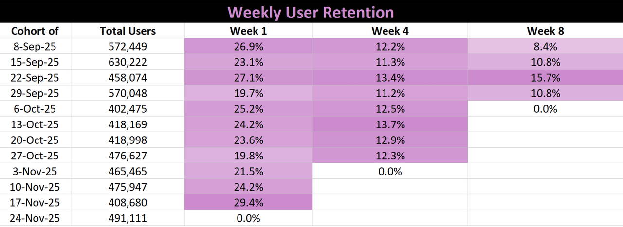 自 9 月初以来,Pump 每周平均活跃地址为 48.2 万个。在一周内,其用户留存率平均为 24%。