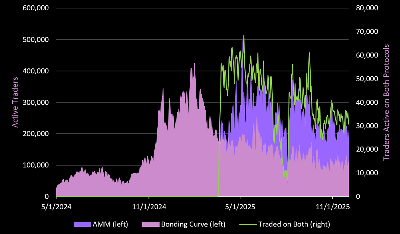 在过去的 90 天里,Bonding Curve 平均每天有 10.6 万个活跃地址——比今年第一季度(Pump/Solana 的狂热高峰期)下降了 60%。