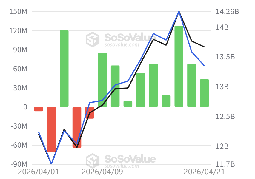 其中 4 月 17 日单日净流入高达 6.6391 亿美元,为近期最高;4 月 14 日和 4 月 20 日分别录得 4.115 亿和 2.3837 亿美元净流入;4 月 15 日贡献 1.86 亿。