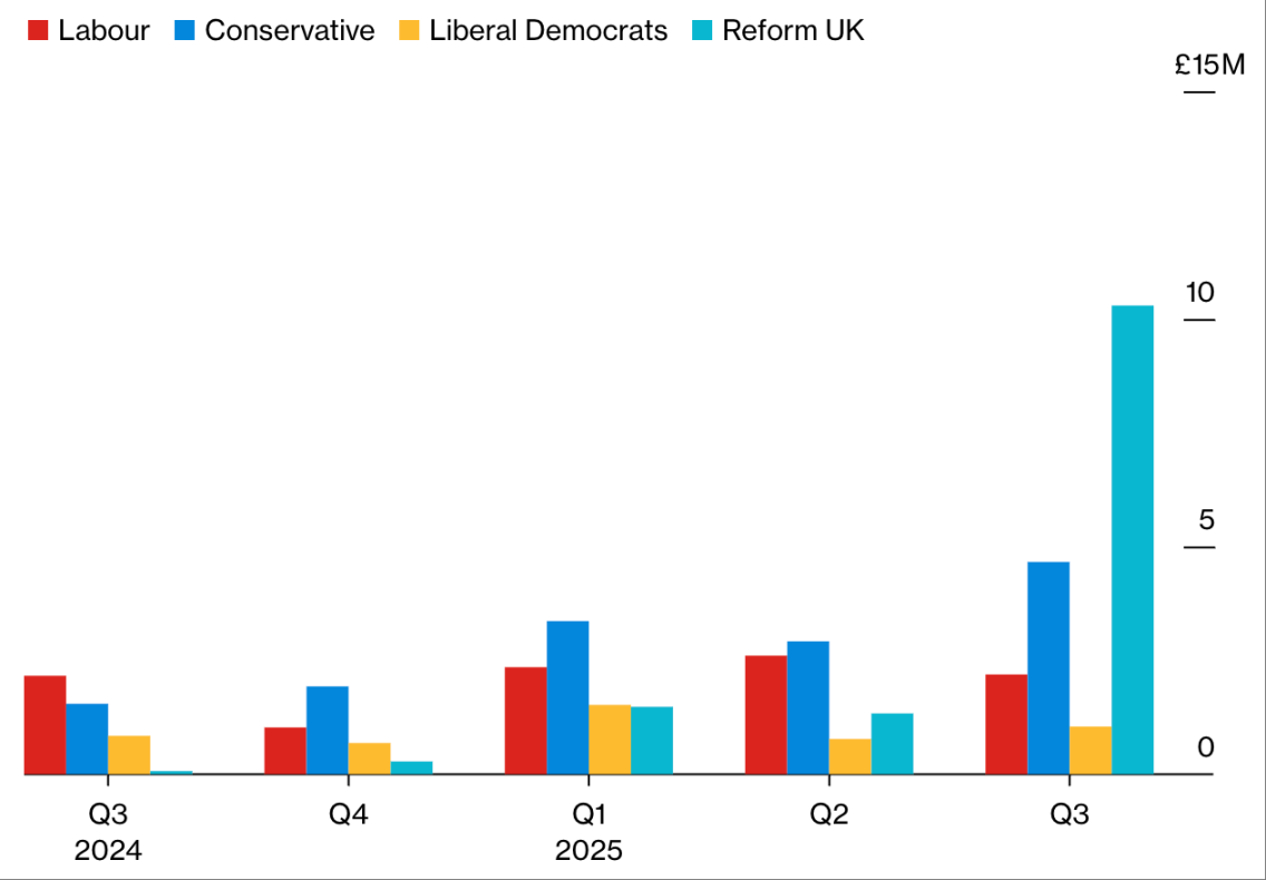 Nigel Farage 领导的英国改革党(Reform UK)在第三季度获得的捐款超过英国其他所有政党,这得益于加密货币投资者 Christopher Harborne 一笔 900 万英镑(约合 1200 万美元)的创纪录捐赠 —— 这一迹象表明,企业与富豪正认真看待该党在民调中的领先地位。