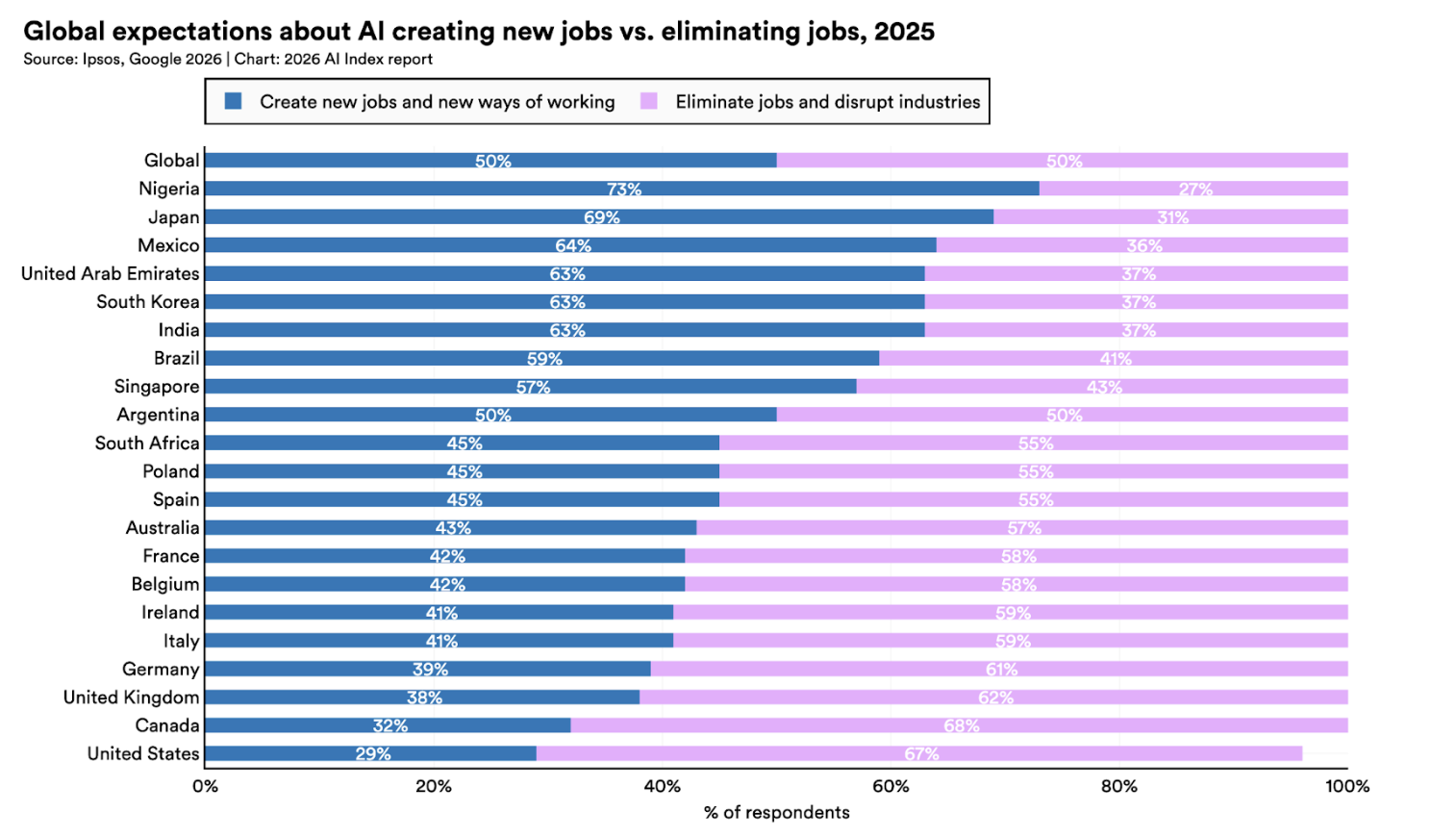 全球范围内,认为 AI 利大于弊的比例从 52%上升到 59%。但同期,对 AI 感到紧张的比例从 50%上升到 52%。