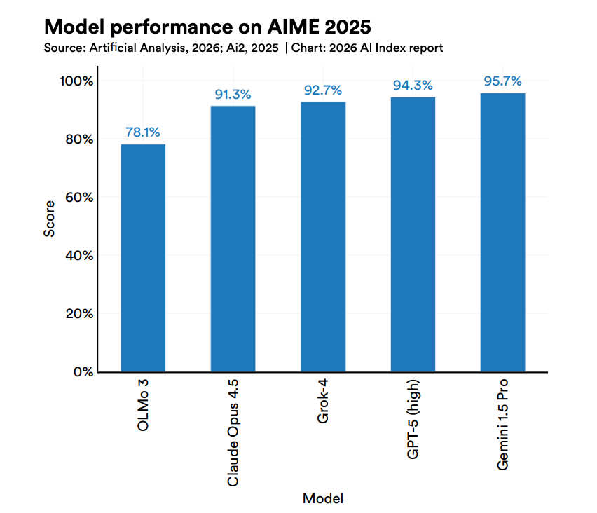 过去一年,全球超 90%的顶尖模型,在博士级科学问题、多模态推理、竞赛数学上的表现,追平甚至超越了人类。