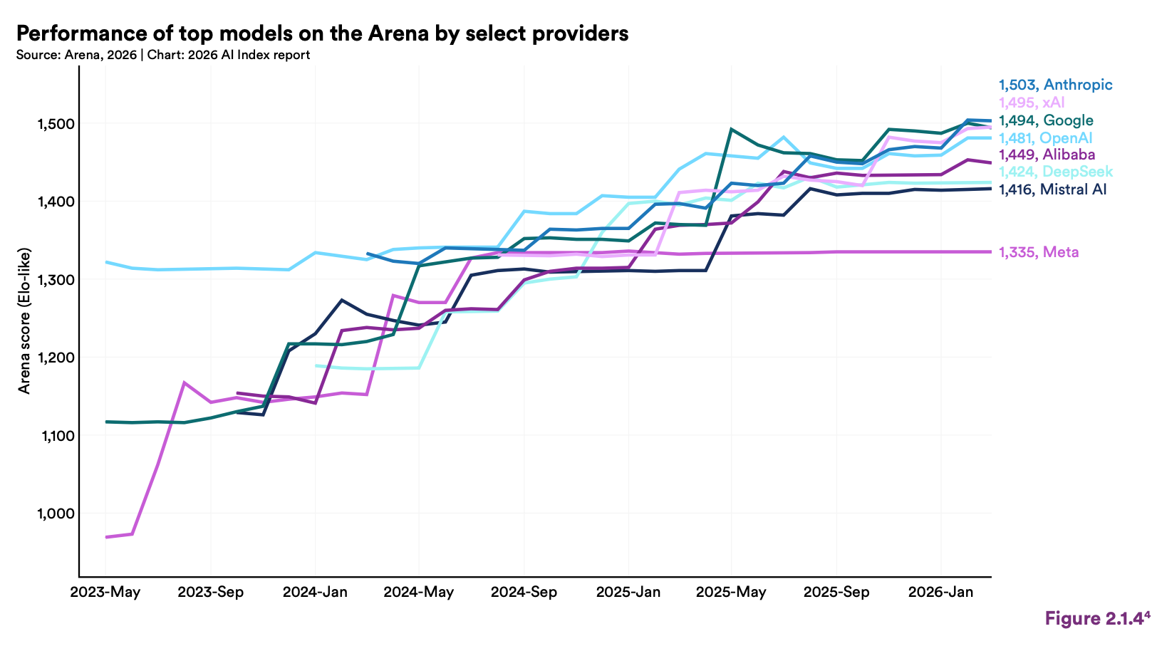 斯坦福把 2023 年 5 月以来 Arena 榜单上的美国第一和中国第一,画在了同一张坐标系里。