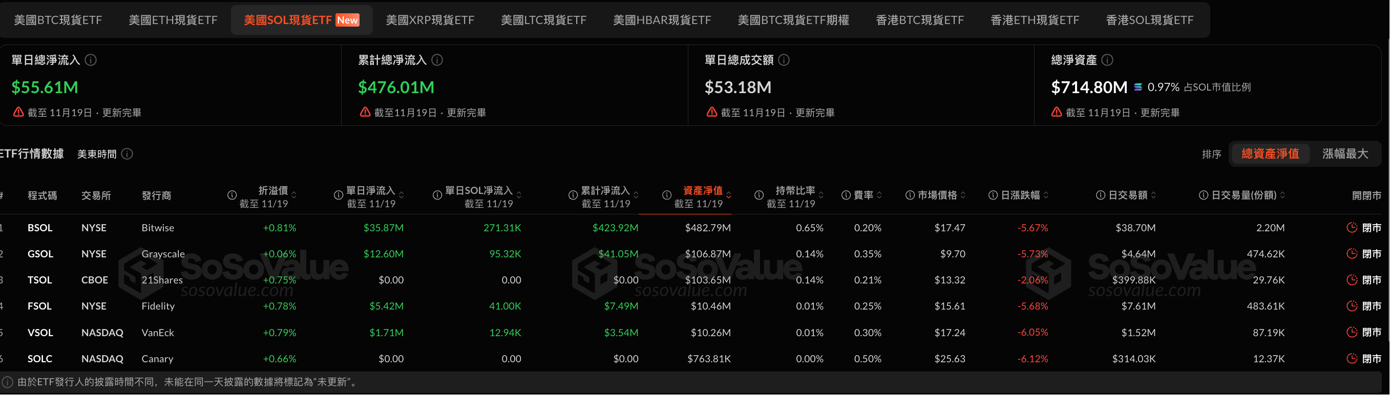 Canary SOLC ETF 是 Canary Capital 与 Marinade Finance 合作推出的现货型 ETF,与 FSOL 同日上市纳斯达克。该 ETF 管理费率为 0.5%,支持链上质押功能,将部分 SOL 持仓用于质押以获取网络奖励,并分配给投资者。然而,上市两日以来,该 ETF 资金净流入为零,资产净值仅为 76.38 万美元,市场表现欠佳。