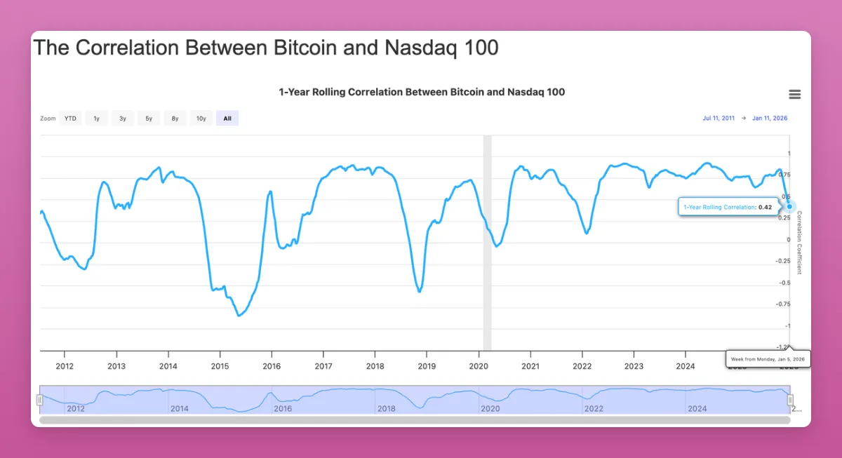 或许更为关键的是,比特币的表现与传统风险资产纳斯达克截然不同。目前,二者相关性为 -0.42,是自 2022 年以来的最低水平。