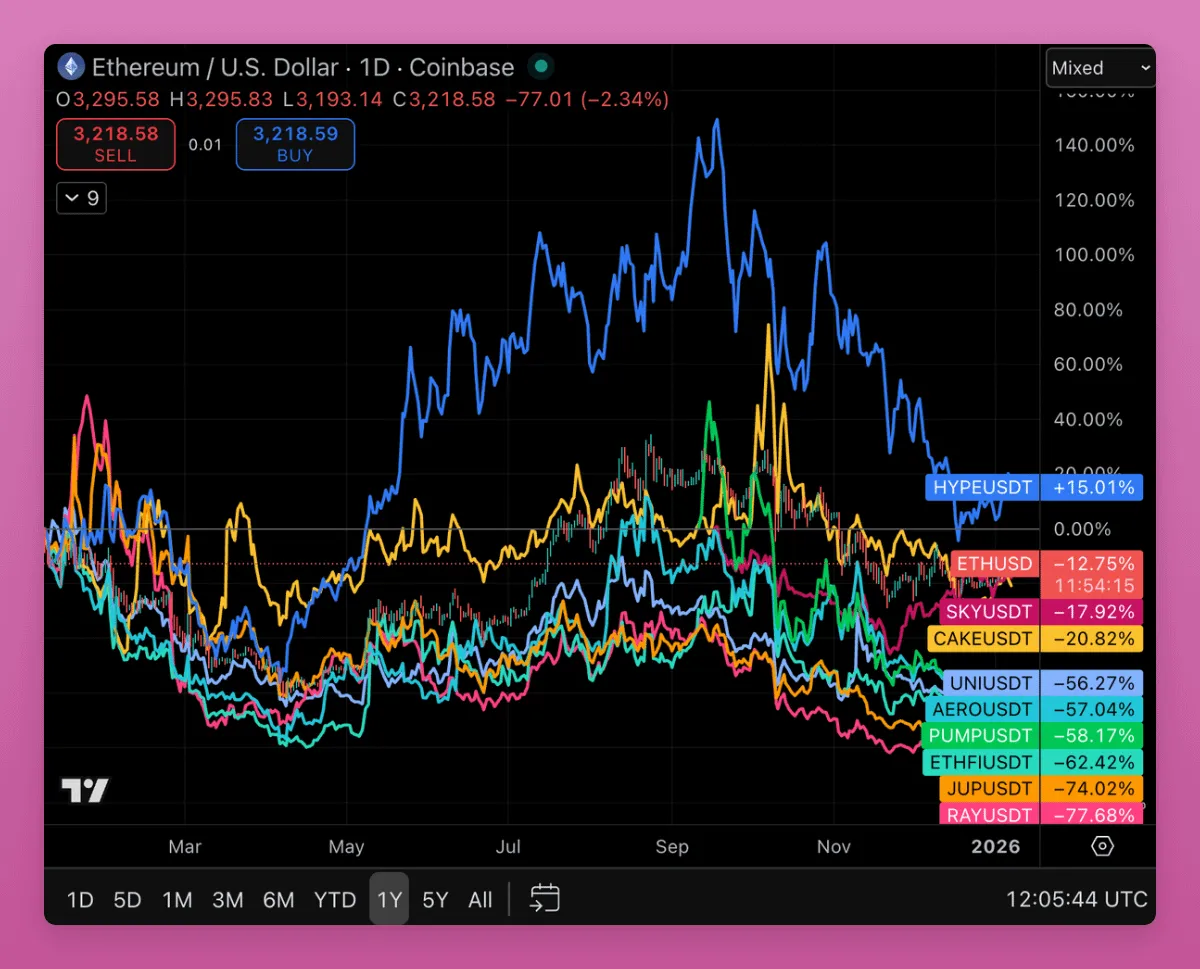从 DeFillama 上按「持有者收入」排名的顶级项目来看,情况似乎一目了然:除了 HYPE 之外,所有高收入共享代币的表现都优于以太坊。