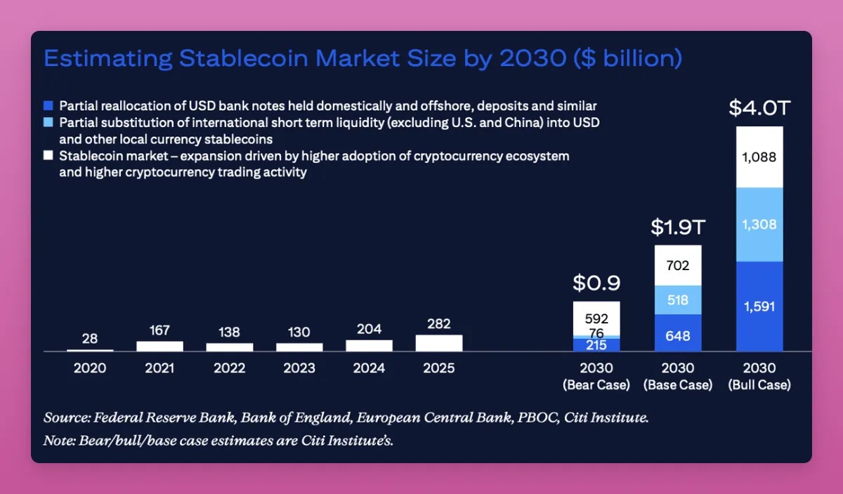 话虽如此,我之前关于 USDT 市场份额下降的判断是正确的。USDT 的市场份额从 67% 降至 60%。考虑到 USDT 的资产配置结构,对我而言,持有 USDT 的风险与收益并不匹配。尽管 USDT 市场份额有所下降,但其市值仍在增长。从整个行业来看,花旗银行预测,到 2030 年,稳定币的市值将从目前的约 2800 亿美元增长至 1.9 万亿美元(基准情况)甚至 4 万亿美元(乐观情况)。