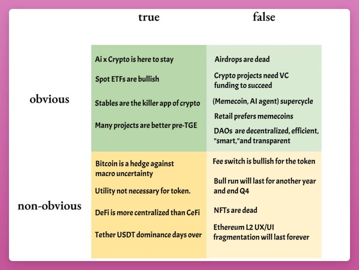 一年前,我撰写了《2025 年加密货币市场的真相与谎言》。彼时,众人皆热衷于预测和分享比特币更高的目标价,而我渴望构建一个与众不同的分析框架,探寻大众预测可能出现的偏差,并据此采取不同的立场。目标很简单:挖掘那些已然存在,却被忽视、不受欢迎或遭误解的想法。