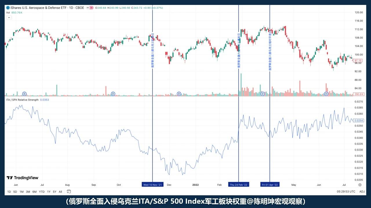 俄乌战争全面入侵真正爆发之后,ITA 相对标普500的强弱不是走强,反而是走弱。也就是说,开战那一刻,市场并没有马上按「军工受益」这条线去交易。它先交易的是更宏大的力量:风险偏好、流动性、宏观不确定性。