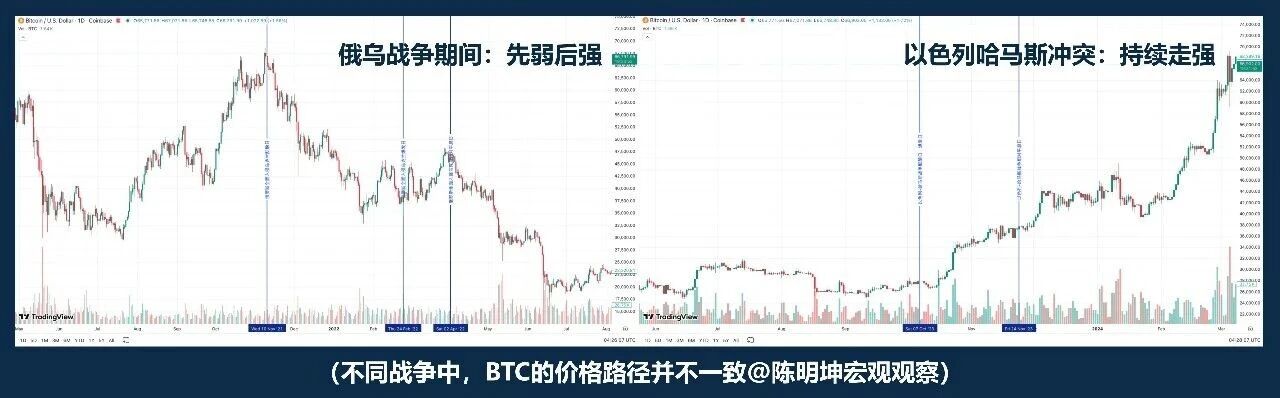 如果战争一来,BTC 就一定上涨,那么不同战争样本里的表现至少应该比较一致。但从俄乌冲突、以哈冲突到近年的中东升级,事实并不是这样:有时它下跌,有时它走强,有时先跌后稳。