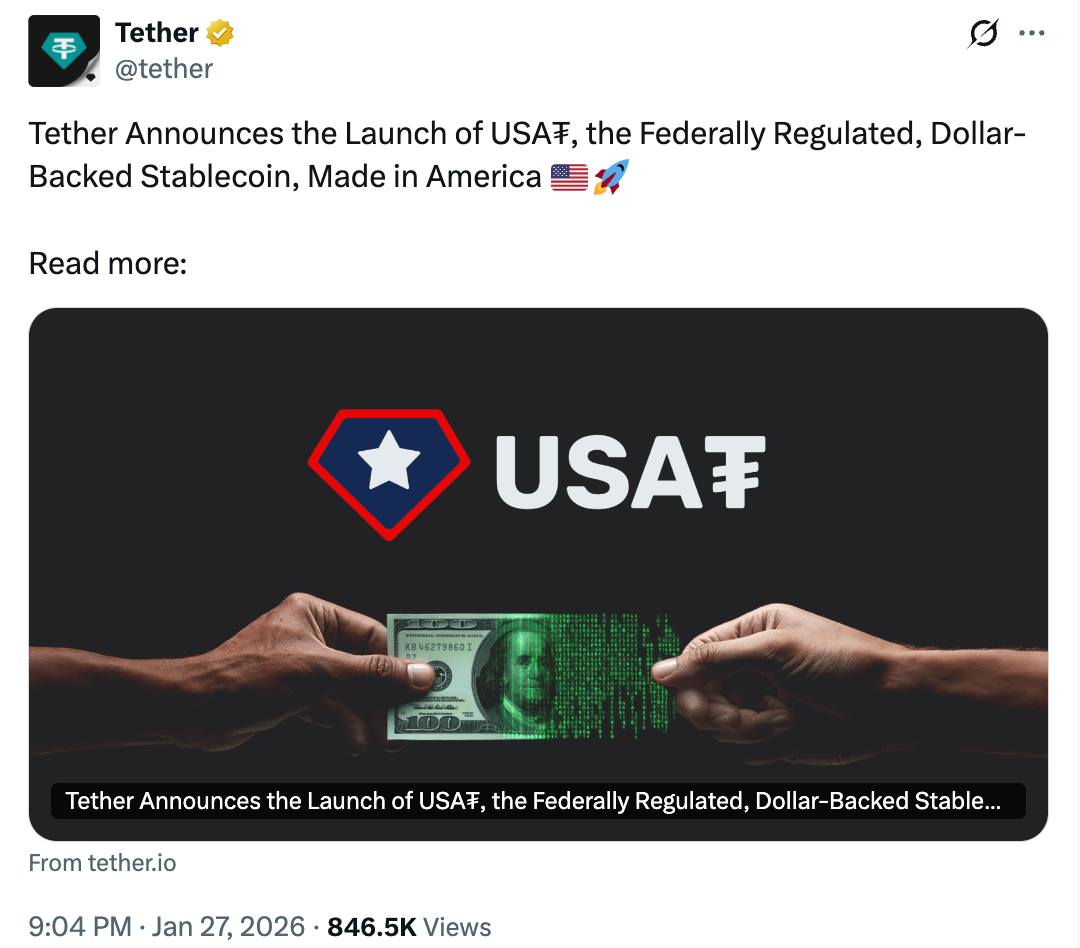 从首次官宣至正式登场,历时四个多月的筹备,Tether 昨日终于上线了美元合规稳定币 USAT。