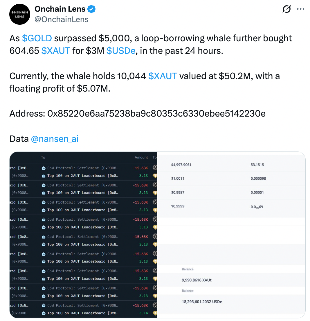 从市场动态来看,近几个月来,XAUT 已经受到了众多巨鲸投资者的青睐,大额增持现象频发。据 Lookonchain 监测,曾因 ETH 亏损 1880 万美元的巨鲸地址(0x037 开头)正在加倍押注黄金:自 2024 年 12 月 13 日以来,该地址已花费 3604 万美元以每枚 4786 美元的均价购买了 7536 枚 XAUT。1 月 22 日,据 Onchain Lens 监测,0x852 开头的巨鲸地址在过去 25 天内通过循环借贷,以 4463 美元的价格花费约 4213 万美元购入 9439 枚 XAUT;1 月 24 日,该地址再次购入 604.65 枚 XAUT,XAUT 总持仓量达到 10,044 枚。这类巨鲸增持的案例不胜枚举,表明了市场对于 XAUT 的认可度不断提高。