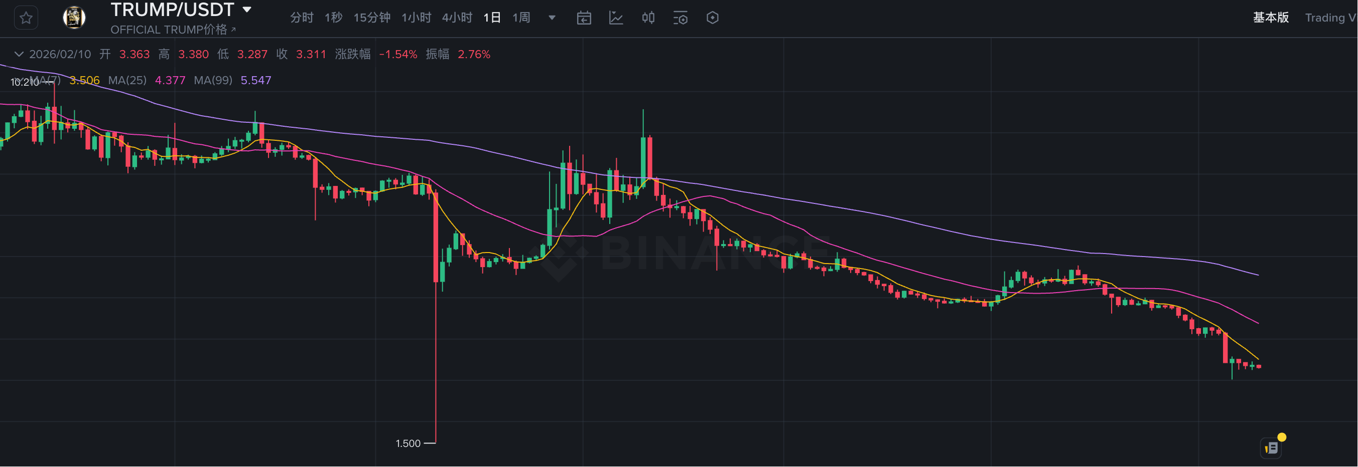 值得一提的是,特朗普个人 Meme 币 TRUMP 当前价格约为 3.3 美元,价格较峰值暴跌超 95%,「10.11」当日更是跌至 1.5 美元,创下过去一年的新低。这也意味着市场对于特朗普的「个人符号」已趋于理性。