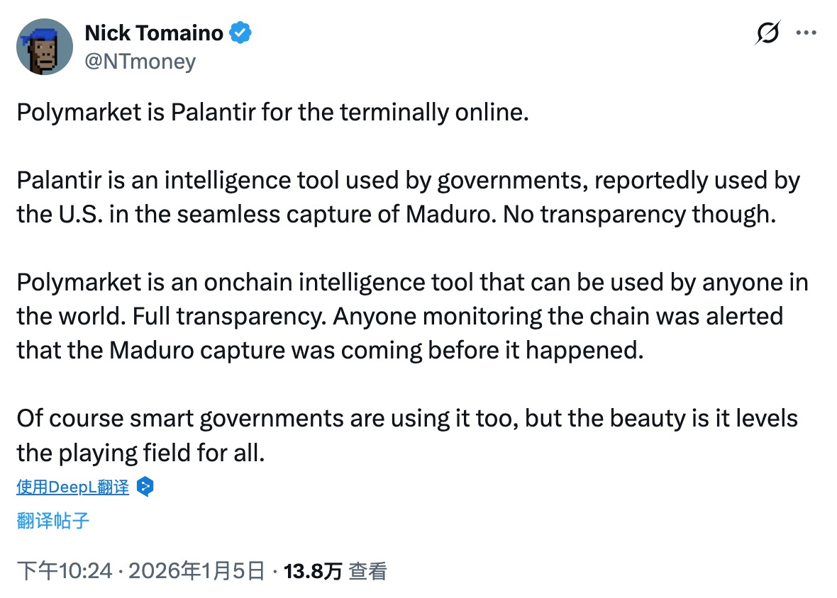 今年 1 月,1confirmation 创始人 Nick Tomaino 曾就马杜罗相关内幕交易的质疑发布了一段耐人寻味的评价。他感叹道:「Polymarket 本身就是公开透明版的 Palantir。」 尽管一些精明的政府也在使用 Polymarktet,但在他的理想图景中,预测市场的伟大之处在于它实现了信息获取的平权化。