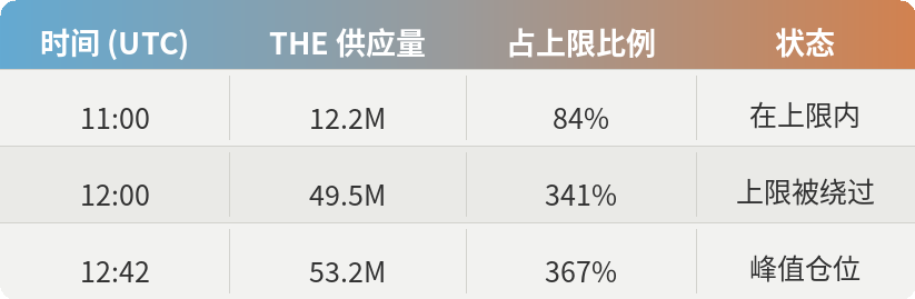 直到攻击当天早晨,攻击者已经建立起一个达到供应上限 84%(约 1220 万 THE)的庞大仓位。这种单一实体不断接近供应上限的集中度增长,在长达九个月的时间里始终在链上可见,却被传统的交易级别监控完全忽略。