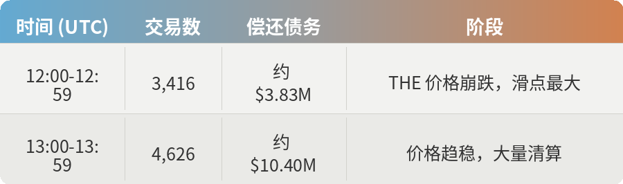 0x1a35 的清算揭示了真正的问题。其抵押品是 THE 本身。254 个机器人通过 8,039 笔交易竞争清算,但获取的 THE 无法以接近预言机报价的价格出售。时间线显示了这一动态: