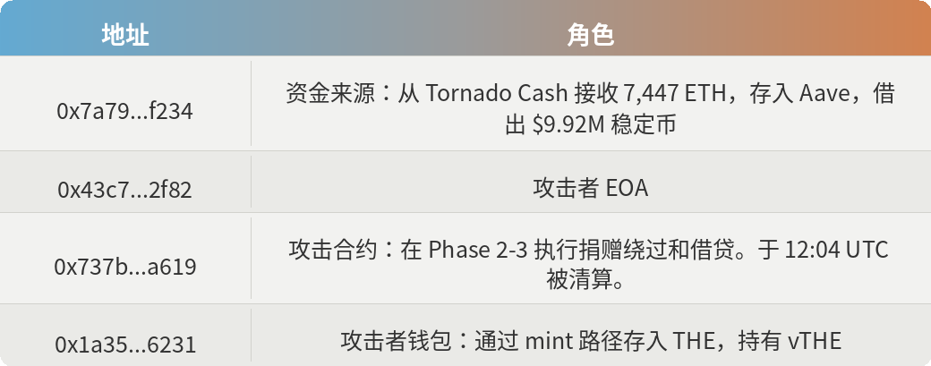 攻击者的资金链条:从 Tornado Cash 接收 7,447 ETH,存入 Aave 作为抵押品,借出 992 万美元稳定币(USDT、DAI、USDC),分散到多个钱包用于购入 THE 和 vTHE。全部 992 万美元均转化为 Venus 上的 THE 仓位。攻击后,所有 THE 抵押品被清算,这笔投入实质上归零。
