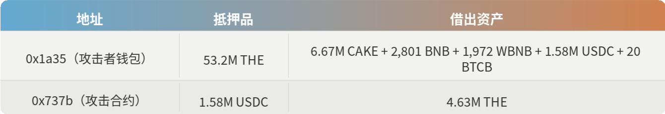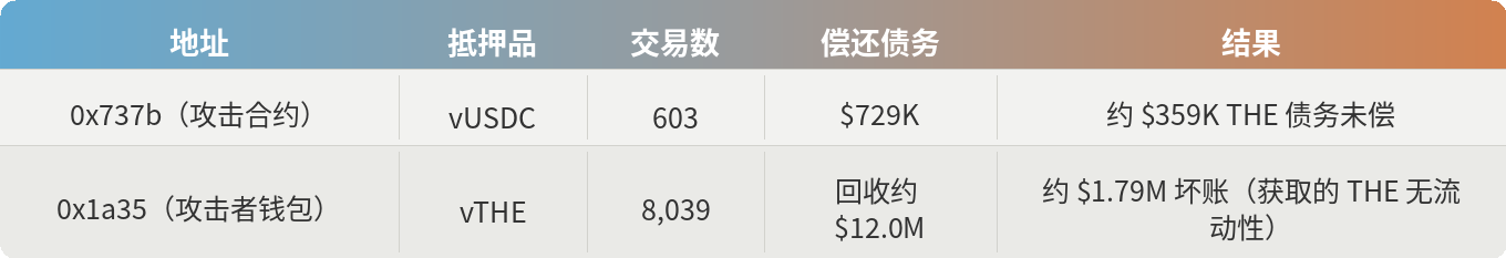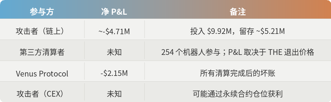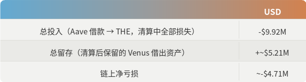 链上操作显然是亏损的。在从 Venus 借出的约 $14.9M 中,攻击者仅留存了约 $5.21M。其余部分或被回收至 THE 捐赠循环,或在清算中被扣押,或被吸收为协议坏账。