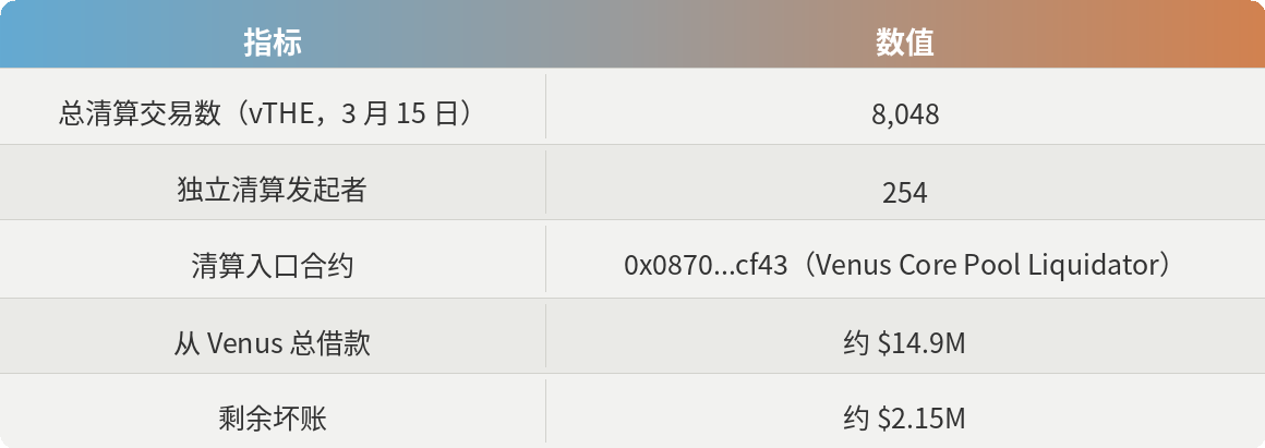 链上清算数据(来自 Venus 的 Dune 仪表板 [5],附加交易级分析)显示: