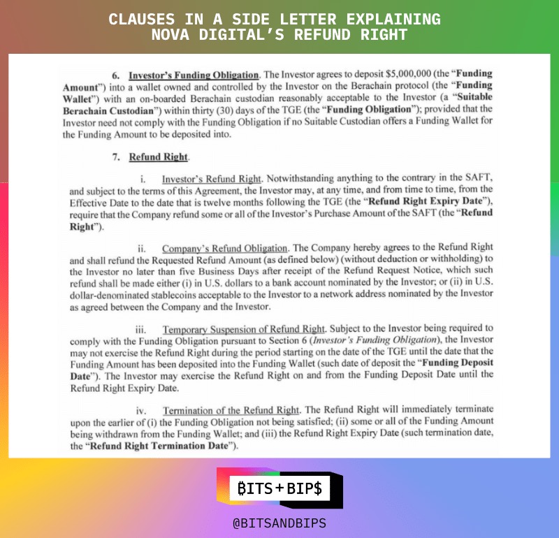 包括 Polychain、Hack VC、Arrington Capital 和 Tribe Capital。这项退款权协议在一份日期为 2024 年 3 月 5 日、附于 Brevan Howard Digital 投资条款清单之后的附属协议中阐明,该协议标题为「Nova 附属协议」(Nova Side Letter)。