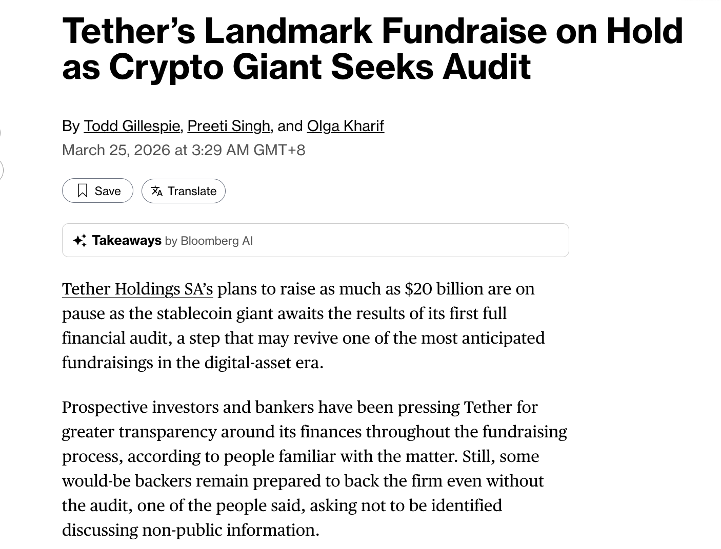 3 月 24 日,Tether 终于公开宣布已与一家四大会计师事务所签订协议,启动其史上首次完整独立财务报表审计。此次审计被认为是金融市场有史以来规模最大的首次审计,涵盖数字资产、传统储备及代币化负债等复杂资产结构,总规模超过 1840 亿美元,标志着 Tether 将正式告别「黑箱」运营模式。