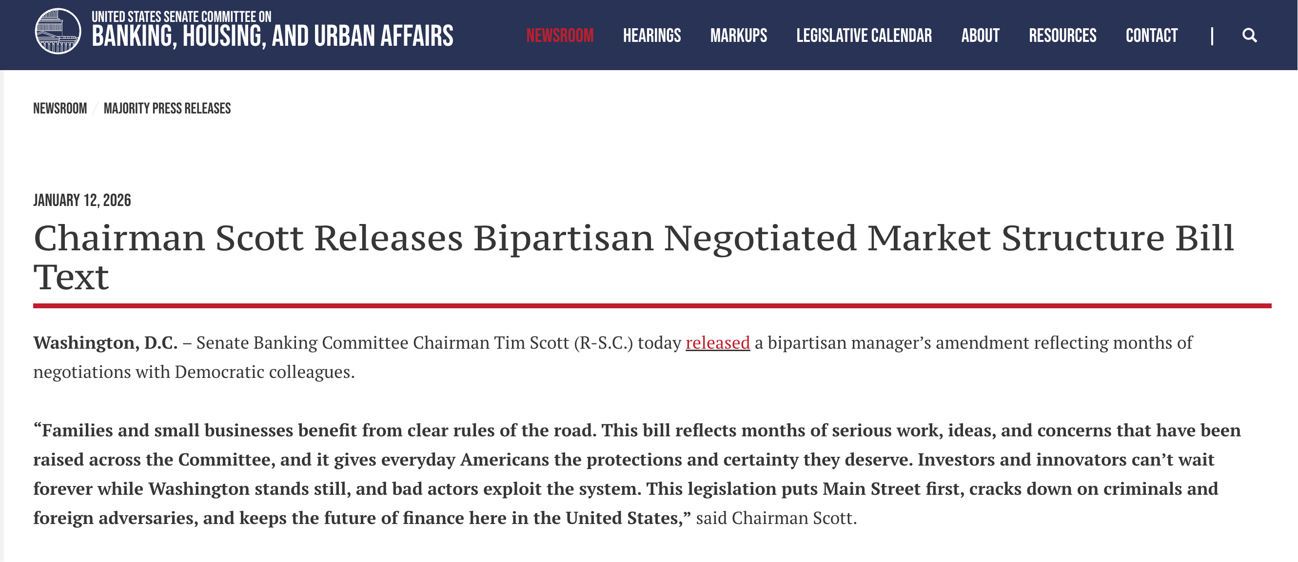 目前,美国参议院银行委员会主席 Tim Scott 已对外公布一份由两党协商达成的《CLARITY 法案》修正案,这份草案篇幅长达 278 页。Tim Scott 表示,该法案是委员会数月来认真工作、集思广益、兼顾各方关切的成果,是一项重要的谈判结晶,它将为普通美国民众提供应得的保护与确定性。
