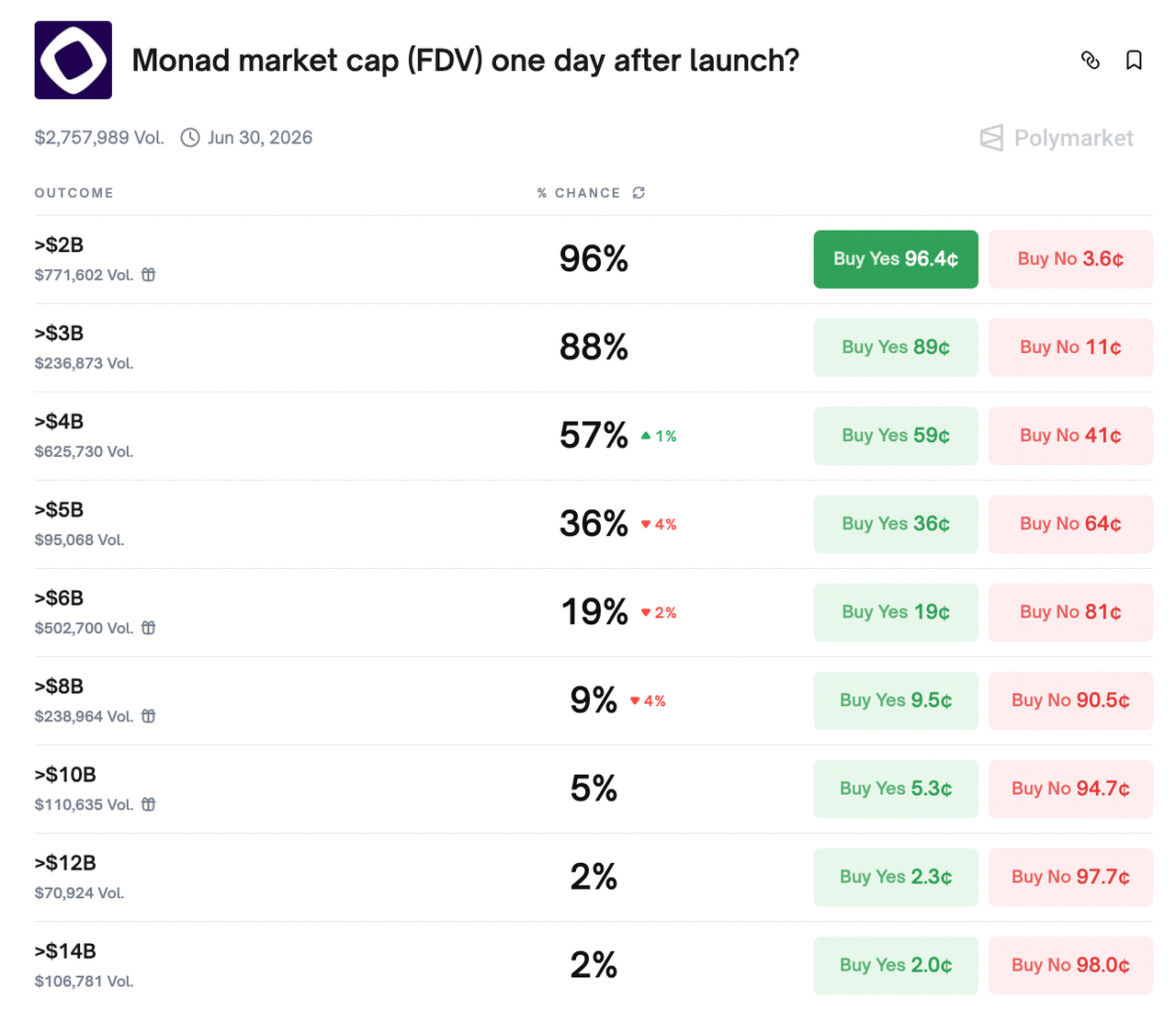 截至撰稿时,Polymarket 的数据提供了更为直观的市场预期。数据显示,市场押注 Monad 代币上线一天后 FDV 超 40 亿美元的概率达到 57%,超 30 亿美元的概率为 88%,超 20 亿美元的概率为 96%。目前该预测市场的成交额接近 276 万美元。