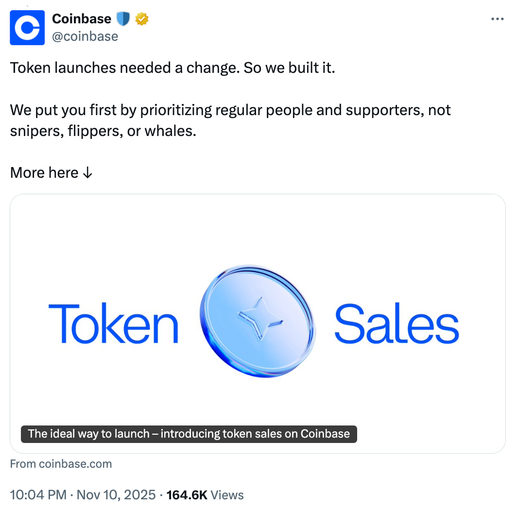 就在昨晚,Coinbase 正式推出端到端代币销售平台,旨在为项目提供更透明、可持续的代币分发机制,同时为全球大部分地区的零售用户开辟一条合规的投资通道。尤其对于美国散户投资者而言,这无疑是一场久违的盛宴。
