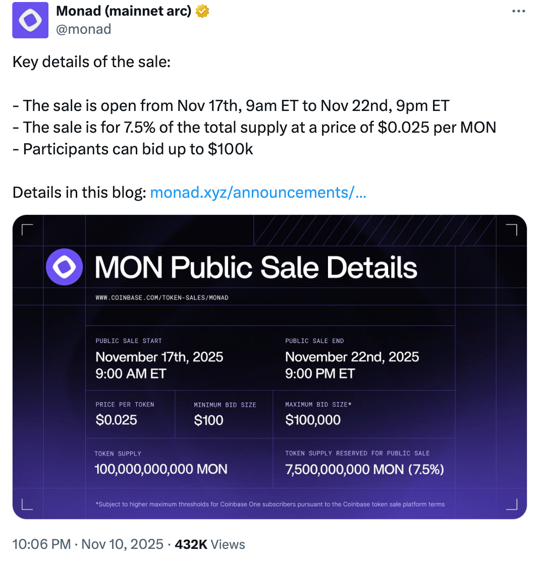 Monad 代币公售时间定于 11 月 17 日 22:00 至 11 月 23 日 10:00。在此次公售中,最多将发售 75 亿枚 MON,单价设定为 0.025 美元/枚。参与门槛为最低申购为 100 美元,最高申购达到 10 万美元。