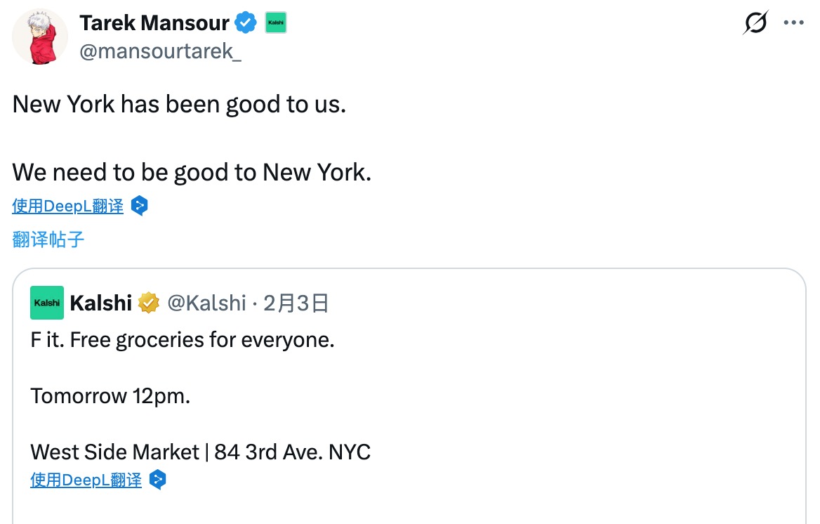 Kalshi 这场免费快闪活动的高明之处在于它同时实现了三重目标:为急需者提供即时救济,为品牌制造病毒式传播内容,更为预测市场这一饱受争议的金融创新,披上了一件温暖的「社区关怀」外衣。正如 Kalshi 首席执行官 Tarek Mansour 在社媒上的
