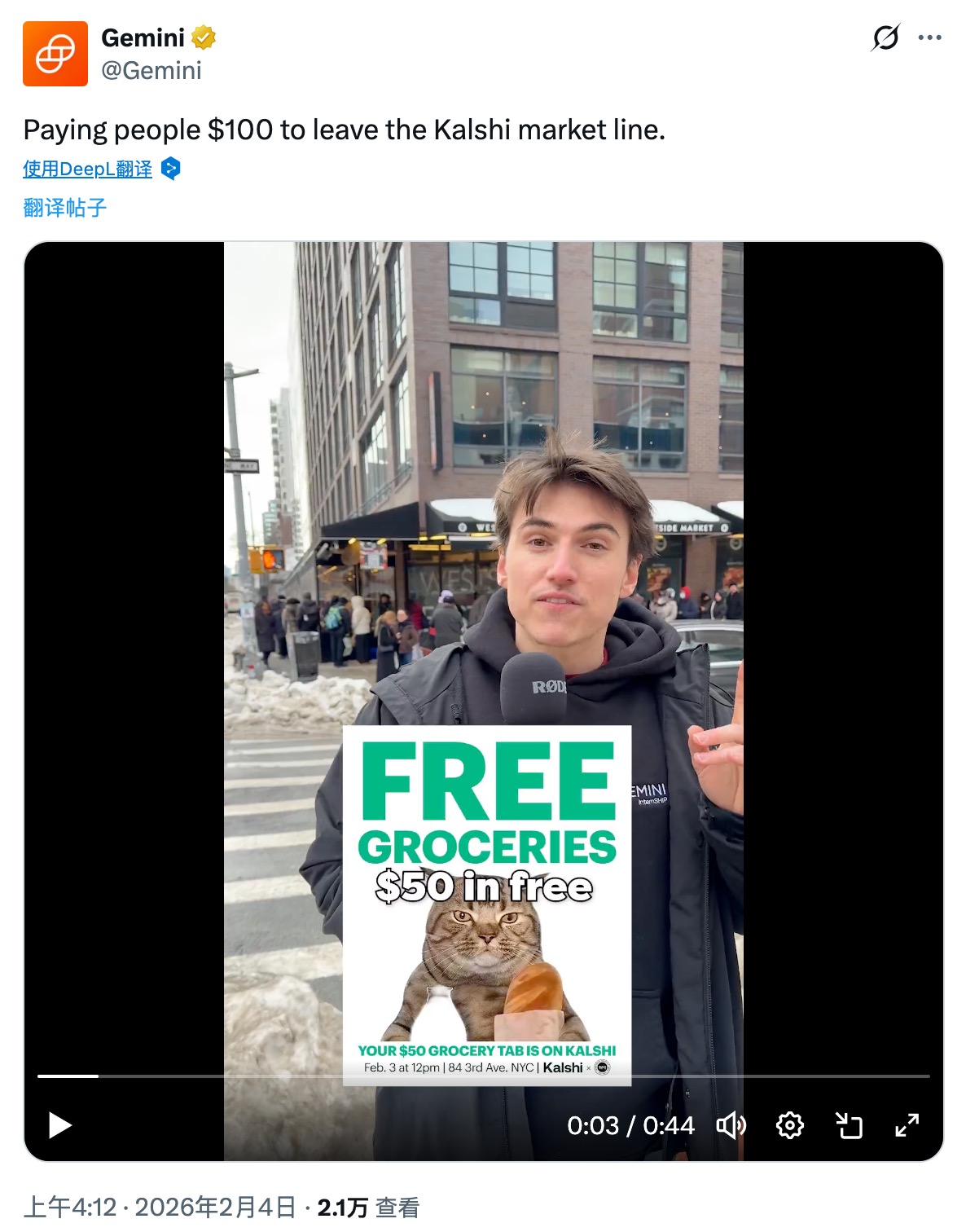 虽然两场活动表面各行其是,但背地里却是暗流涌动。Kalshi 在面对 Polymarket 的跟进时巧妙表示:「我们很荣幸激励了其他公司共同推进这项善举」,言语间既保持了风度,又暗示了自己在行动上的领先。有趣的是,就在 Kalshi 活动进行时,Gemini 直接在队伍旁发起了街头挑战:下载 Gemini Prediction 应用并离开 Kalshi 队伍,即可获得 100 美元。这场突如其来的「挖墙脚」行动,让纽约街头的免费杂货战争,瞬间升级为一场赤裸裸的用户争夺战。