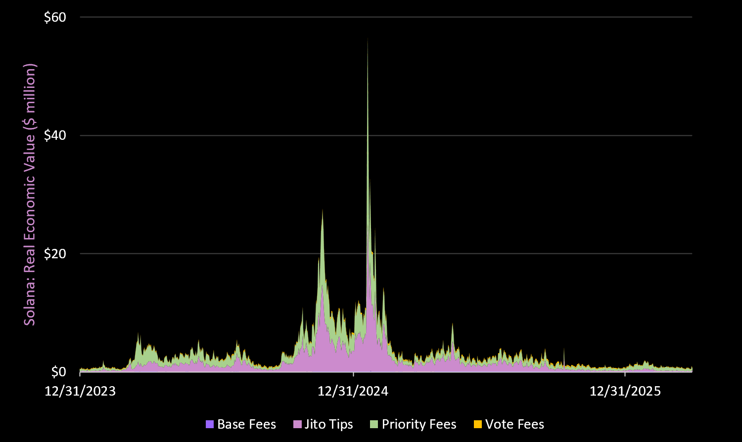 REV = 基础费用、优先费用、MEV(Jito 小费)以及用于访问 L1 区块空间的投票费用。MEV(Jito 小费)通过质押分配给 SOL 持有者。其余费用归属验证者,其中 50% 的基础费用将被销毁。