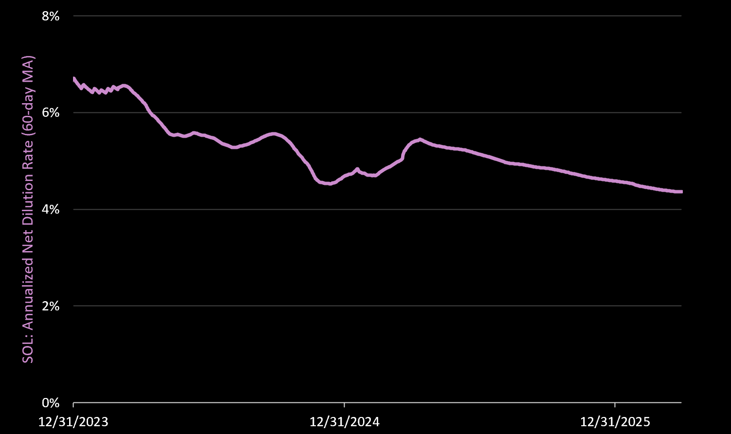 净稀释率 = 每日协议发行量减去销毁的 SOL/流通供应量(年化)。正的净稀释率对(未质押的)SOL 持有者具有稀释作用。