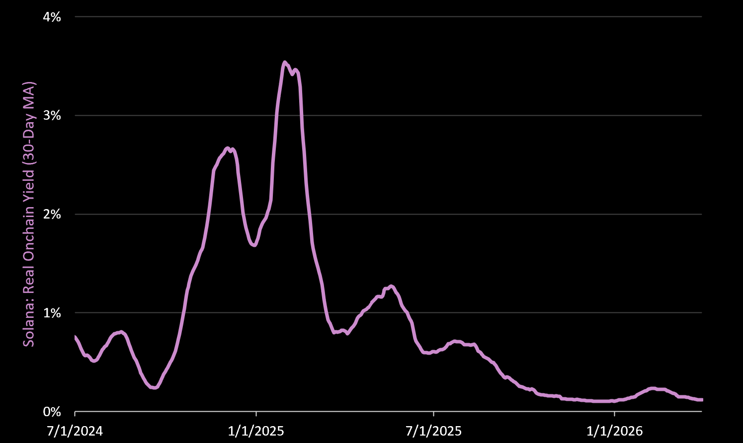 Solana 的核心理念是「快速 DeFi」。速度和周转率是网络费用的主要驱动因素。这也是 Solana 的实际收益率在 2024/2025 年持续高于以太坊的原因。我们认为,Solana 的速度最终将使其在风险偏好较高的环境中成为资本的磁石。这使得 SOL 成为一种反应极其灵敏、高贝塔系数的资产。