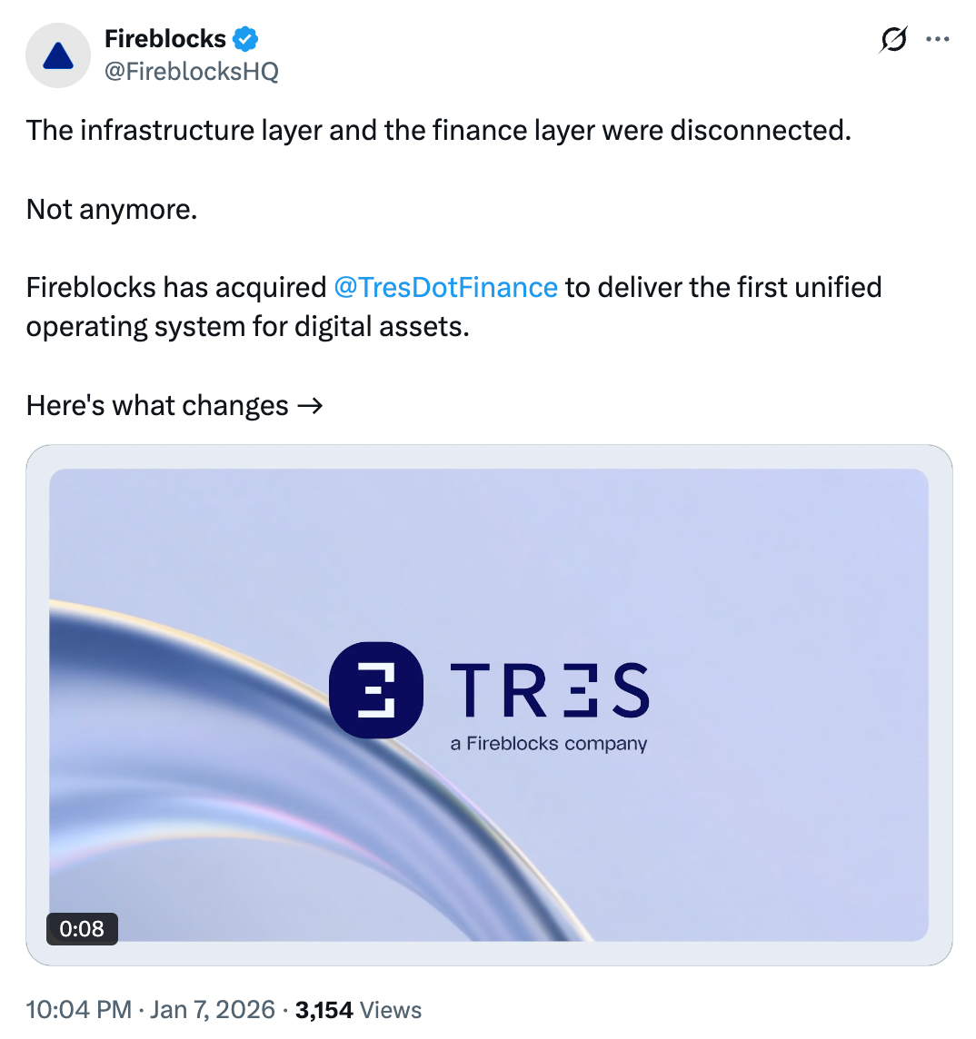 简而言之,加密原生企业缺乏将链上数据转化为合规报告的标准化工具,而传统金融机构则面临链上业务与核心系统的数据鸿沟。Fireblocks 在公告中指出,这些问题的根源在于:数字资产基础设施与现有金融体系存在显著脱节。而其收购 TRES Finance 正是瞄准这一结构性缺口,计划打造首个完整的数字资产操作系统,实现链上活动与传统财务系统的原生融合。