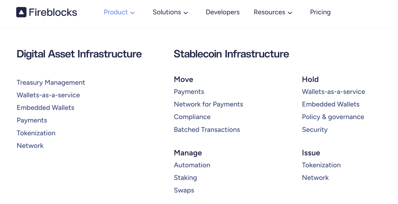 截至目前,Fireblocks 平台已保障了 10 万亿美元交易,服务超过 2400 家机构,客户包括纽约梅隆银行、瑞士信贷、法国巴黎银行等传统金融巨头和 Revolut、BlockFi、Galaxy Digital 等加密原生企业。该公司业务主要分为数字资产基础设施和稳定币基础设施两大板块,前者核心产品包括财务管理、钱包即服务、嵌入式钱包、支付和 Fireblocks Networks;后者则涵盖了支付网络、批量交易、质押等更多的产品和业务。