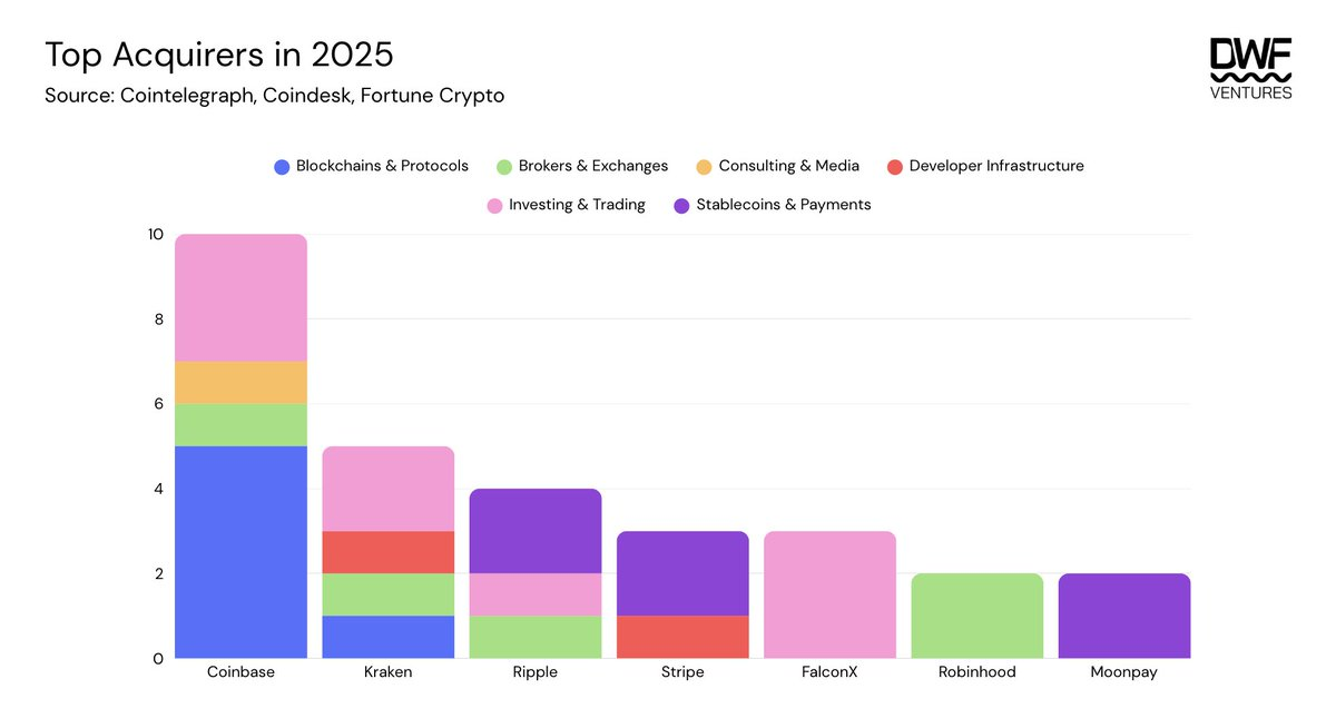 主要的收购方包括 Coinbase、Kraken 和 Ripple,它们涉足了多个领域。特别是,Coinbase 通过收购传统和创新去中心化应用(DApps),巩固了其成为「全能应用」的雄心,重点是将链上技术带给大众。这或许可以归因于交易所之间的竞争加剧,以及它们渴望成为一站式应用,以吸引自己的用户群体和资金流。