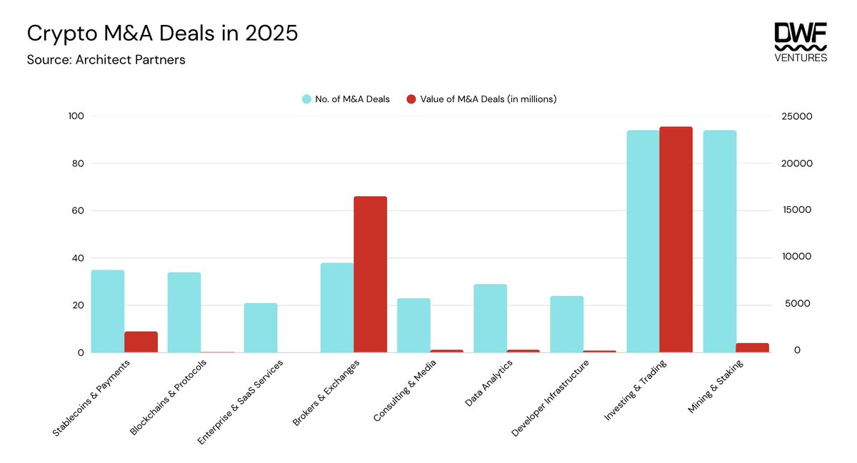 根据 Architect Partners 报告,2025 年,在传统金融(TradFi)公司纷纷发力以及监管态度愈发友好的推动下,加密货币领域的并购活动达到了五年来的最高点。特朗普政府出台一系列对加密货币友好的政策后,数字资产资金库(DATs)迎来蓬勃发展,因为资产负债表上持有数字资产不再那么具有争议性。此外,公司也将重点转向收购,因为这是获取某些牌照、提高合规性的更高效途径。总体而言,适当监管框架的引入为并购活动的加速扩展铺平了道路。