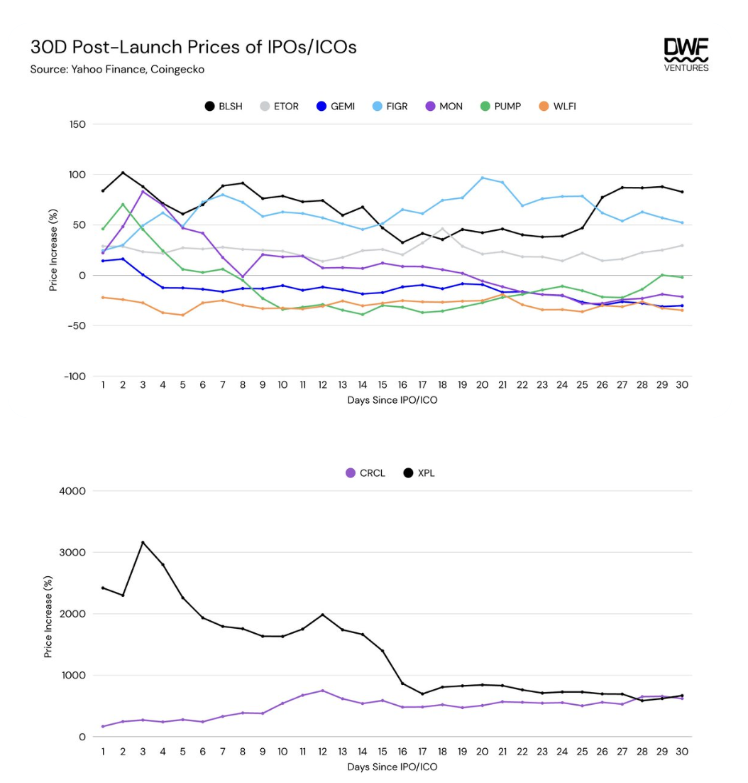 CRCL 和 XPL 是这一规律的例外,它们从一开始就实现了巨大涨幅,为投资者带来了 10-25 倍的回报。然而,它们的表现也遵循了上述趋势——XPL 在达到高点后的两周内回撤了 65%,而 CRCL 在同一时期则持续稳步上升。