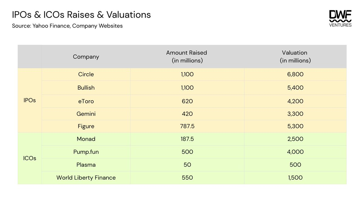 由此我们观察到,IPO 和 ICO 的估值相对接近。某些 ICO 项目(例如 Plasma)的定价特意低于机构投资者的估值,旨在为散户投资者提供更大的上涨空间和参与机会。平均而言,IPO 公开发行的股份比例在 12% 至 20% 之间,而 ICO 则在 7% 至 12% 之间。特朗普家族项目 World Liberty Finance(WLFI)则是一个明显的例外,其公开出售的代币超过总供应量的 35%。