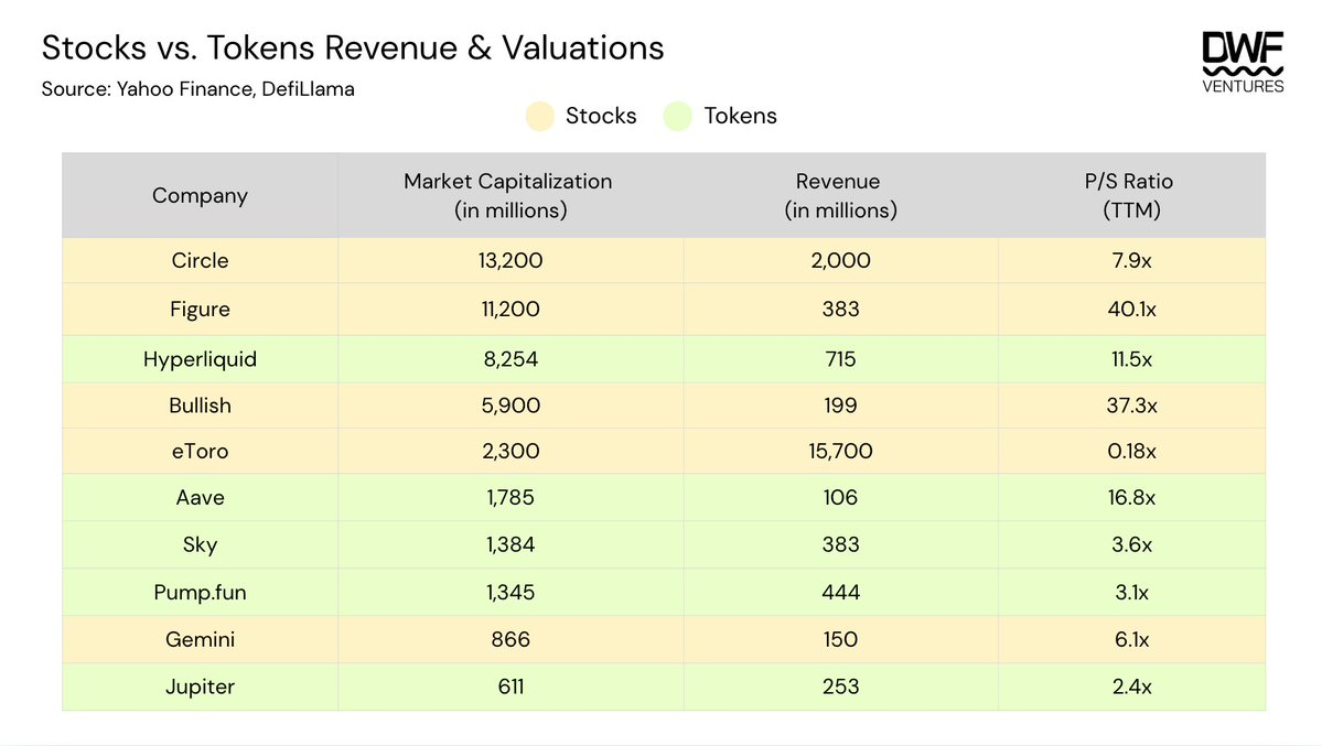 例如,Figure 推出了面向散户和机构投资者的 RWA 借贷池,并且是首个获得美国证券交易委员会(SEC)批准发行收益型稳定币(YLDS)的公司。Bullish 是一家受监管的交易所,旗下还拥有 CoinDesk 等其他业务,这使其价值超越了单纯的交易服务。所有这些因素都可能导致其溢价较高。