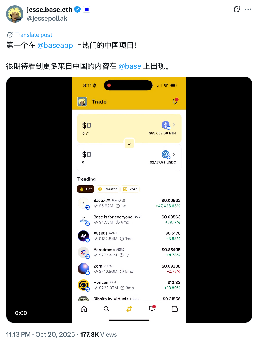 在半小时后,Base 创作者兼协议主管 Jesse Pollak 也发推表示:「Base 人生」是第一个在 Base App 上热门的项目,很期待看到更多来自中国的内容在 Base 网络上出现。