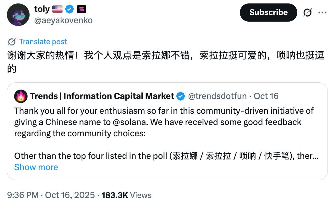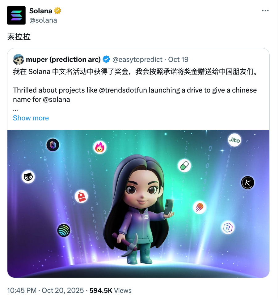 Solana 的中文化命名提议正是在这个关键时期被提出。10 月 14 日,内容代币化平台 Trends.fun 发起「为 Solana 征集中文名」活动,并设置 100 枚 SOL 的奖池。