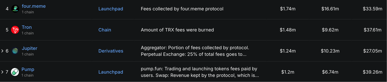 此次 BNB Chain 生态 Meme 币的崛起,对 Solana 生态造成了不小的冲击,虹吸了后者大量资金。目前,Solana 上市场最大的 Meme 发射平台 Pump.fun 的收入,已被 Four.meme(BNB Chain 上 Meme 发行平台)迎头赶上。DefiLlama 数据显示,Four.meme 7 日收入为 1661 万美元,几乎达到 Pump.fun 同期收入(674 万美元)的三倍;而 Four.meme 30 日收入也达到了 3359 万美元,正逐步逼近 Pump.fun 的 3926 万美元。