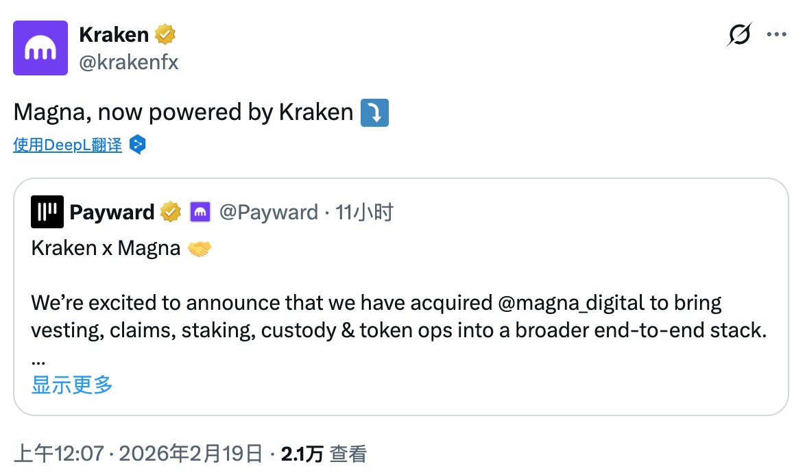 收购 Magna,表面上看只是 Kraken 并购列表上的又一行小字,实则是其掌控代币「全生命周期」的关键一环。在 IPO 静默期前,Arjun Sethi 和他的团队正用真金白银的收购,向市场传递一个清晰信号:Kraken 早已不是那个仅仅提供加密货币买卖的交易所,而是一个覆盖资产发行、交易、衍生品全链条的综合性金融基础设施。当下一轮周期来临时,Kraken 或许将不再是那个被动等待项目方上币的「通道」,而是从代币设计之初就深度参与的「共建者」。