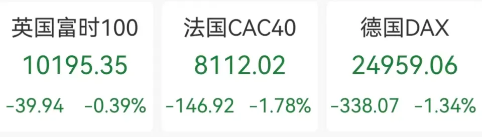 欧洲斯托克 50 指数下跌 1.72%,英国富时 100 指数下跌 0.39%,法国 CAC40 指数下跌 1.78%,德国 DAX30 指数下跌 1.34%,富时意大利 MIB 指数下跌 1.32%。