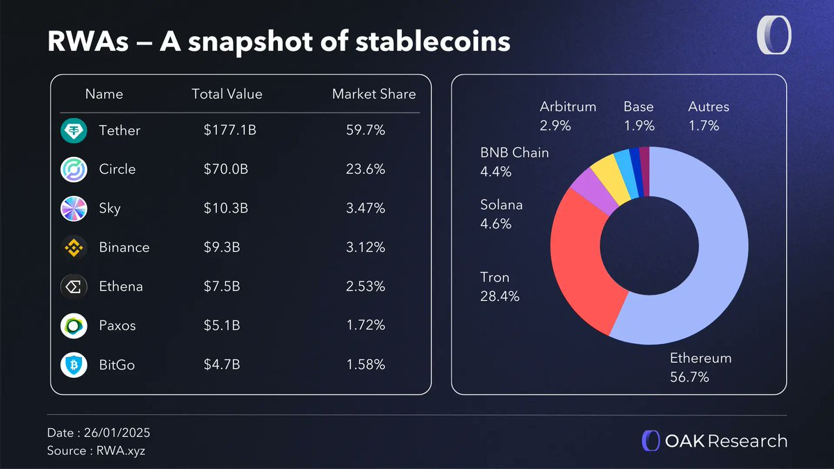 因此,稳定币在RWA架构中扮演着双重角色。一方面,它们是主要的流动性渠道,允许资本流入和流出生态系统。另一方面,它们通过其储备金,代表着代币化应用最广泛的案例之一,这些储备金对应于大量已有效代币化的主权债务组合。