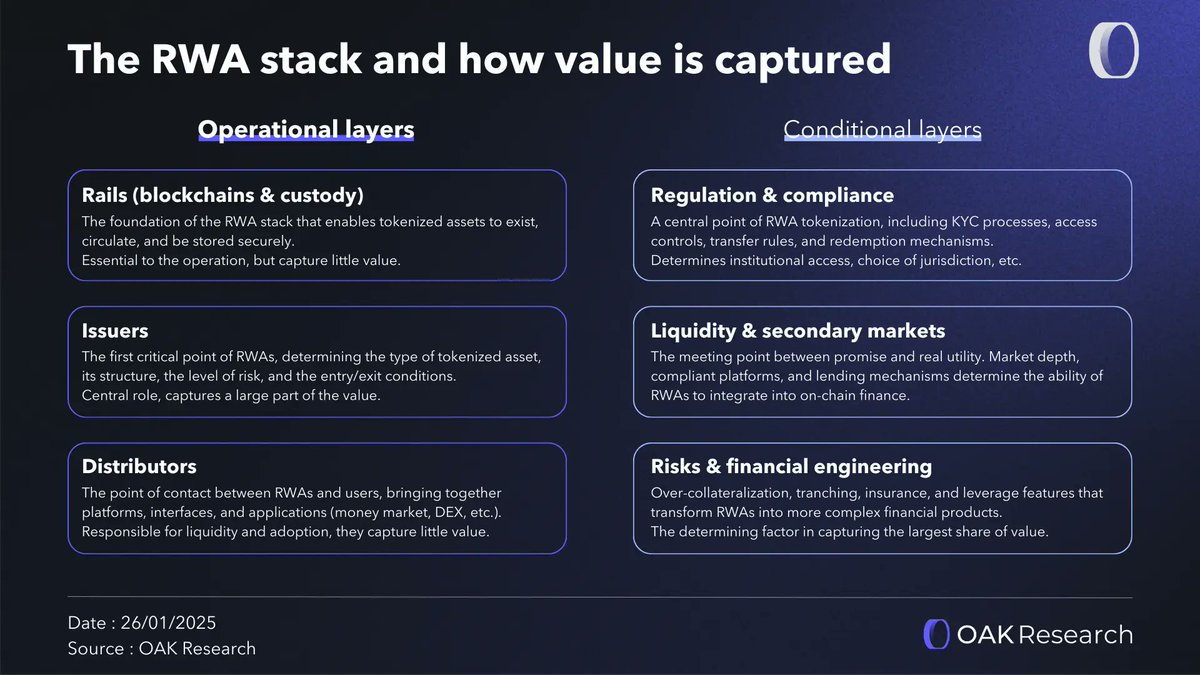 因此,风险加权资产(RWA)并非单一的、同质的资产类别。它们依赖于一系列相互依存的层级结构,涵盖从区块链、托管到分销平台等各个方面。所有这些层级对于系统的正常运作都至关重要,但它们获取价值或权力的方式却不尽相同。