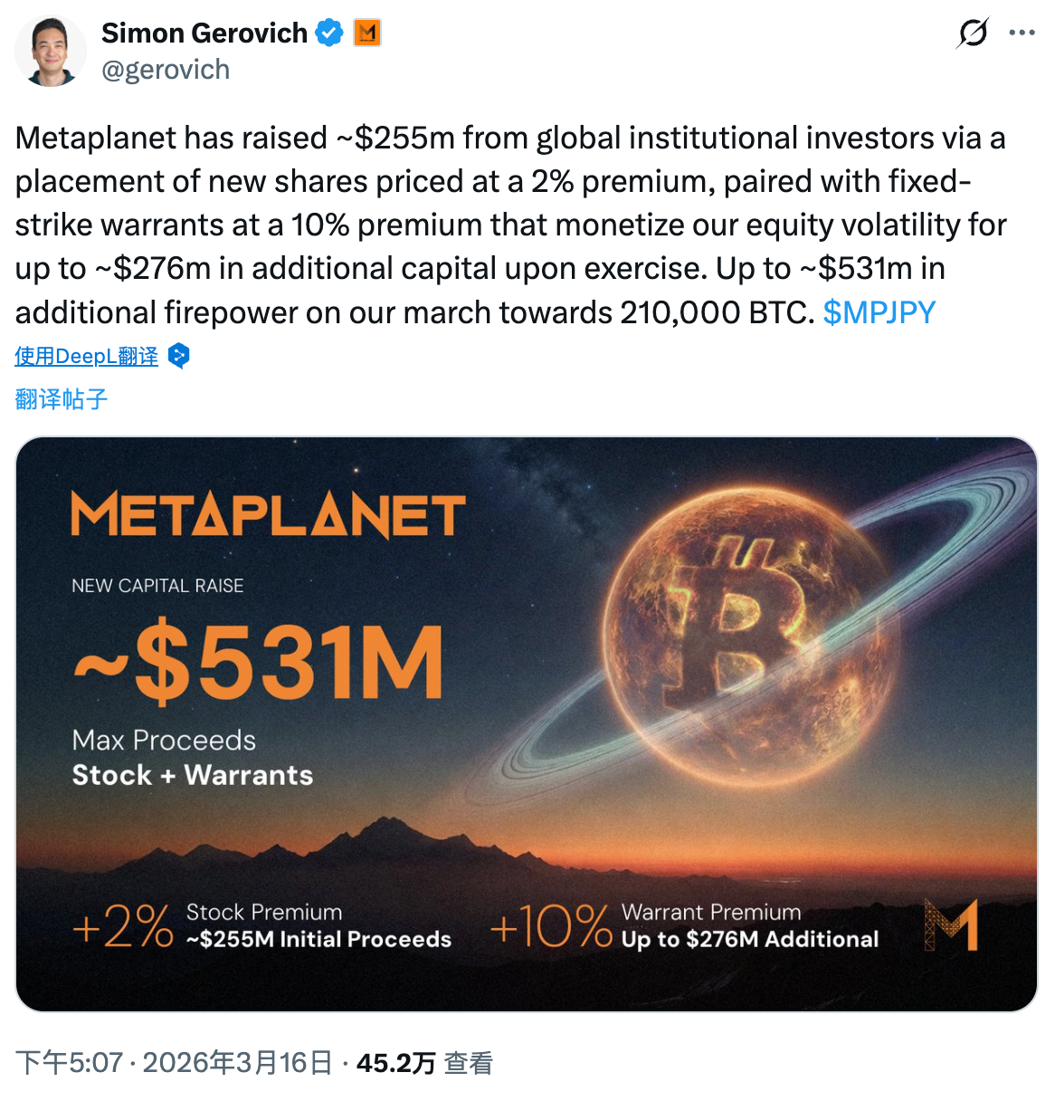 3 月 16 日,Metaplanet 首席执行官 Simon Gerovich 连发两条动态: